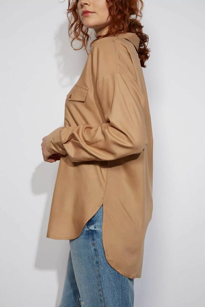 Tiene un bolsillo al frente a la altura del pecho con tapa y botón forrado en la misma tela.