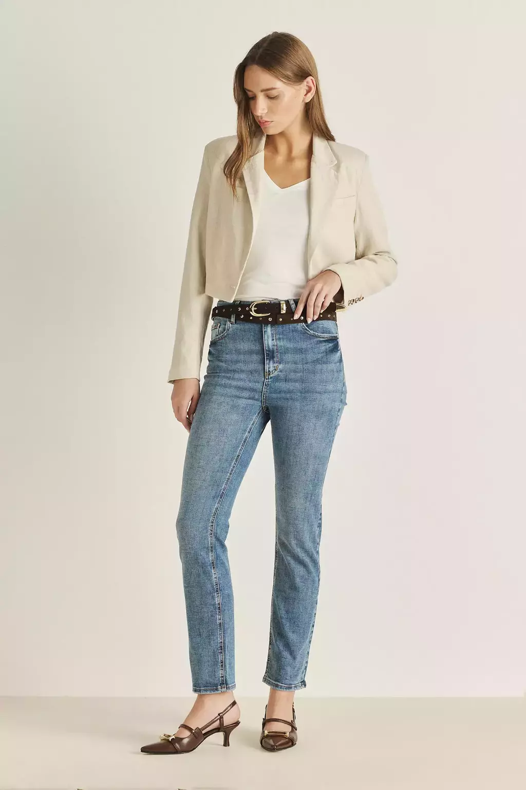 Pantalón de denim tiro alto fit skinny. Tejido premium importado con viscosa que aporta suavidad, microfibras de poliester que le dan estabilidad a la prenda, evitando que se estire y stretch que aporta comfort. Lavado indigo medio con suaves localizados e iluminaciones. Boton, remaches y chapita pulidos espejo exclusivos de la marca.