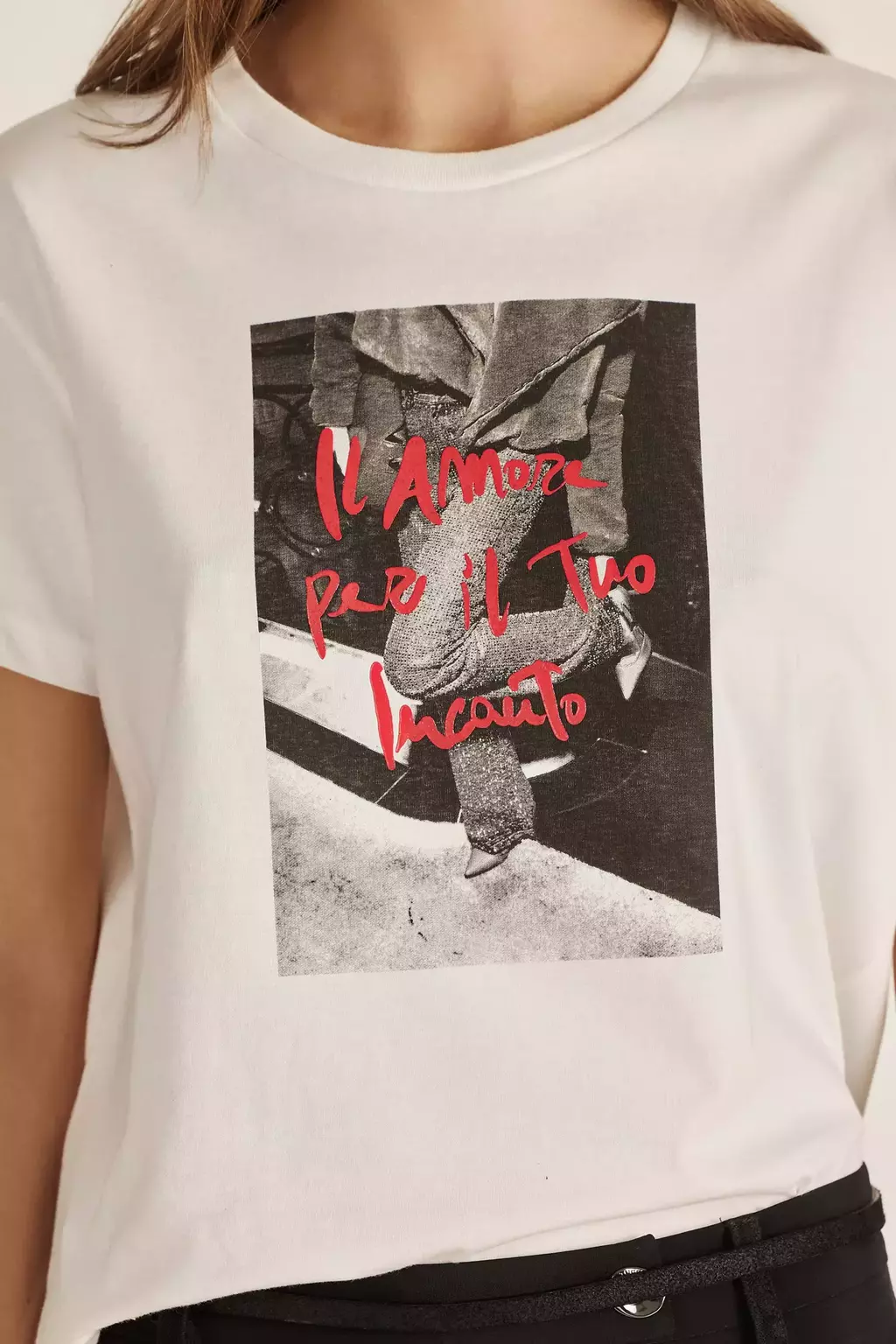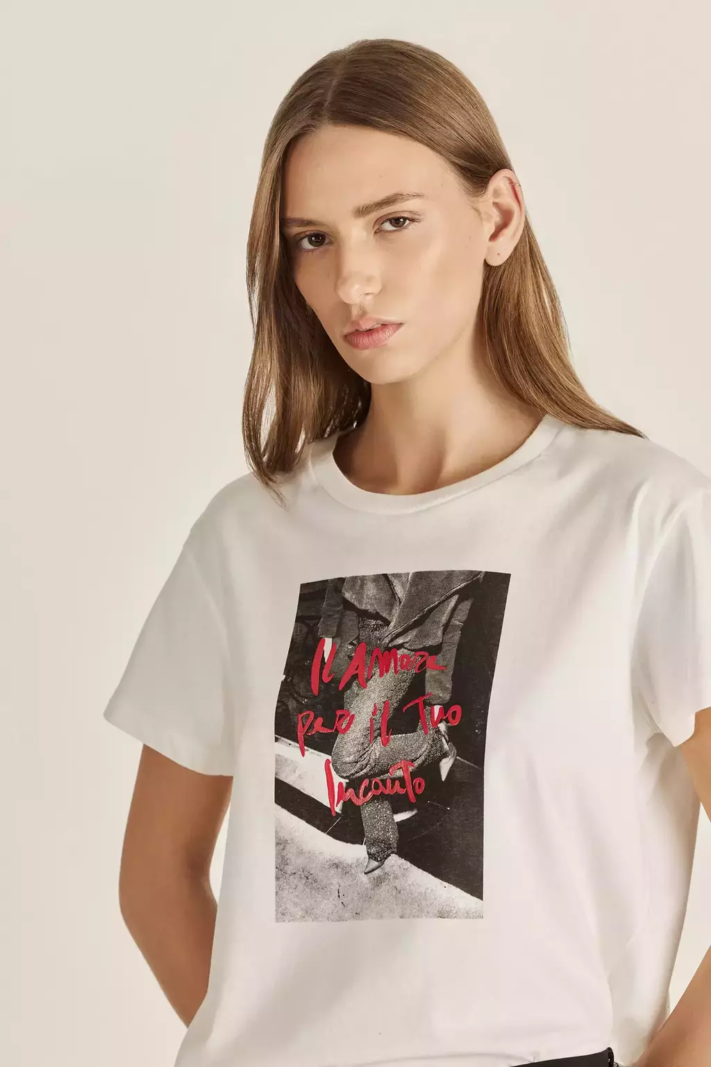 Remera confeccionada en tejido liviano de algodón con estampa exclusiva de la temporada de Verano 26. El calce es relajado. En el escote trasero lleva un dije con el logo de la marca. Usala para un look Tucci muy audaz.