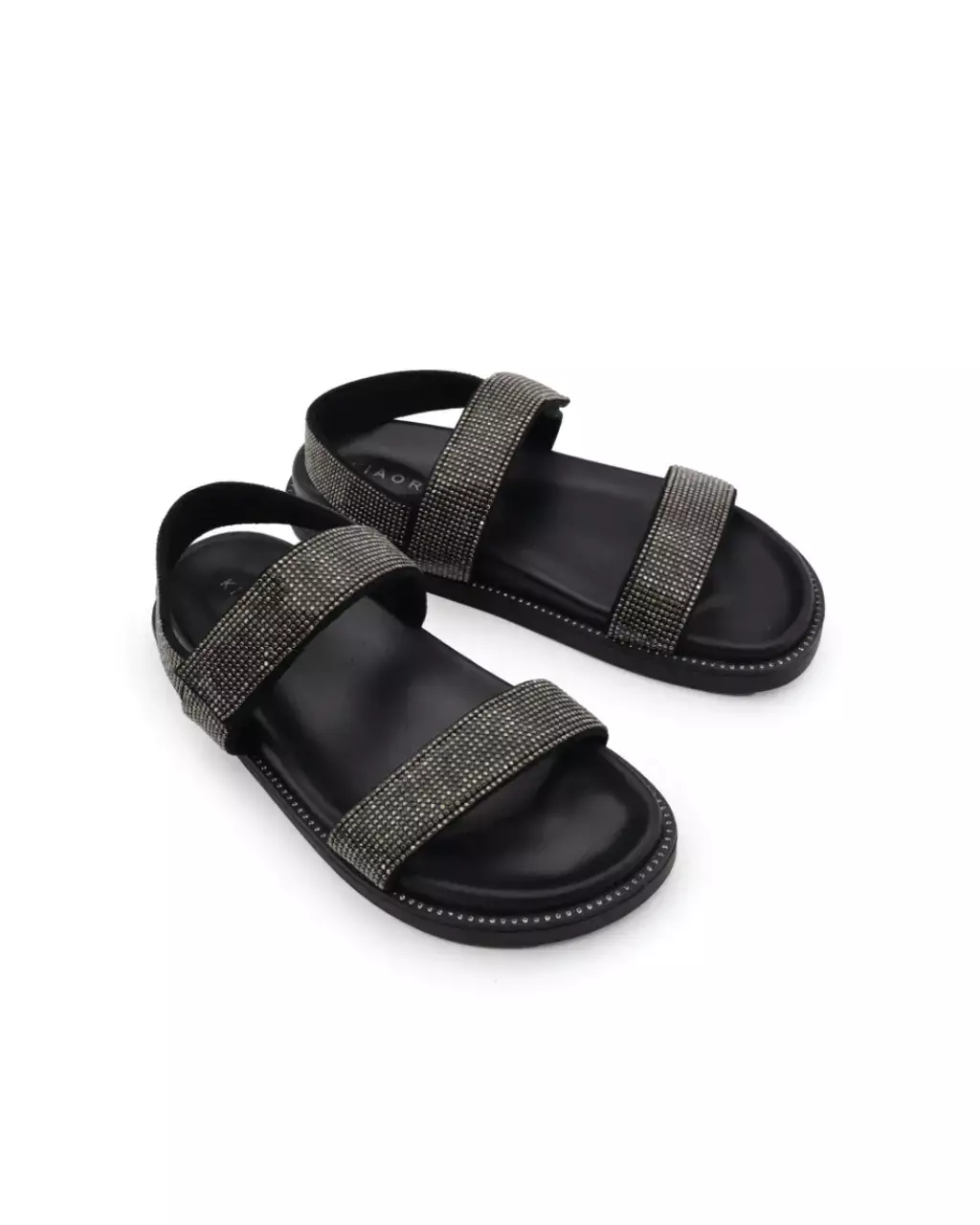 Sandalia baja de PU en color negro, diseñada con doble tira que aporta un toque moderno y detalles en strass que realzan su diseño. Ideal para quienes buscan comodidad y un calzado versátil para el día a día.